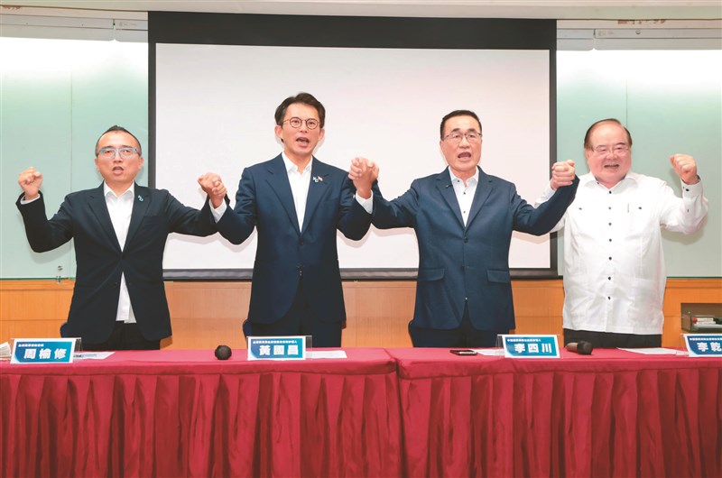 國民黨、民眾黨共推新北市長參選人,民調結果由前台北市副市長李四川(右2)勝出。落敗的民眾黨主席黃國昌(左2)則表示會全力輔選,兩人在記者會上與國民黨副主席兼祕書長李乾龍(右1)、民眾黨祕書長周榆修(左1)牽起手高喊「凍蒜」。圖/余承翰
