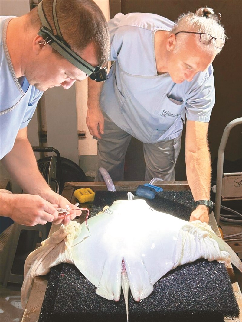 海洋公園獸醫團隊,為一條牛鼻鰩施行緊急開腹手術。