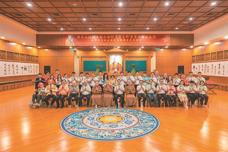 4月25日,馬佛青全國理事33人,在總會長楊桂榮(前排右9)帶領下,前往佛光山東禪寺祖師堂,緬懷佛光山開山祖師星雲大師並表達敬意,並與總住持覺誠法師(前排左7)合影留念。圖/人間社記者洪勇竣