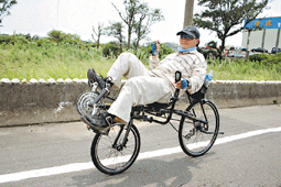 他說,斜躺式單車座椅有靠墊,是躺著騎,手握把在兩側,因不能大幅度的轉頭,一定要裝後視鏡,「騎起來不費力,比走路還輕鬆,很舒服」,因是躺著騎,剛開始要適應它的平衡感,最過癮的是,轉彎時,只要稍移重心即可,「喜歡那種躺著看風景的感覺」。
