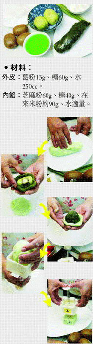 {4}葛粉加糖先拌勻,先加一半的水,把顆粒調開後,再加入另一半,煮至透明狀。{5}趁熱用奶油擠花袋或耐熱塑膠袋將葛粉擠入模型,先擠一半,放入餡料後再把模型均勻擠滿。