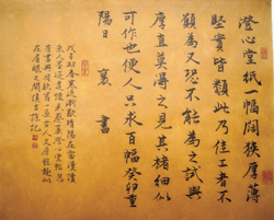 寫字的時候,這種默契更是表現得極為明顯。師兄不但要幫老師拉紙,還要照顧紙張的平順,以及抄寫內容的順序進度,以便讓老師寫字可以一氣呵成。寫書法最重要的是一氣呵成,但最難的也是一氣呵成,因為長條式的書寫需要不時的把紙張往前移動,才能繼續寫,如果沒有人幫忙,就得寫一寫就停下來移紙,所以老師寫字的時候,通常會叫學生幫忙。