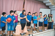 典禮首先以電腦投影播放精心製作的暑期花絮,同學見到與大眾於暑期班上中文課、才藝課與參與各種不同活動的翦影,勾起學習美好回憶,興奮不已,向父母吱喳說明投影內容。在吾愛吾師節目讓同學感謝十三位老師近二個月辛苦指導後,緊隨著同學大展身手的才藝成果展。 (人間社記者張志誠攝)