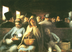 《三等車廂》的畫面裡充滿了貧苦人物,一臉風霜的老婆婆手提著提籃,旁邊挨著一個疲憊不堪在睡覺的小男孩,另一旁是懷抱嬰兒的婦女,在他們後邊,擁擠不已的車廂裡都是在生活線上奔波的人物。雖然有微弱的光從小窗口射進來,車廂裡卻顯得暗淡朦朧。