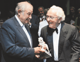 德國作曲家李察.華格納所創,專門演出華格納歌劇作品的拜魯特市的拜魯特音樂節,57年來一直由華格納的孫子沃夫岡.華格納掌舵,終於在爭議聲中退休,各界特別為他舉辦歡送儀式,圖為拜魯特音樂節所在地巴伐利亞省長(左)致贈瓷獅子給沃夫岡(右)作為禮物。(圖/美聯社)