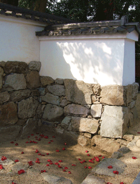 因為時間不夠,放棄比叡山延曆寺,就在山下走走,走著走著,一拐彎就看到滋賀院門跡前這片落花,午後的陽光斜斜灑在白牆上,一朵一朵的山茶像飄在水上的紅燭,令旅人忍不住屏息靜觀,等待陽光一寸一寸輕移。日本人區分山茶與椿是以落花的方式,茶花落的時候是花瓣一片一片凋零,椿則是一整朵一整朵掉落,在日本人心中,椿花落就像武士斷頭,壯烈榮耀,符合他們大和民族的悲劇美學。