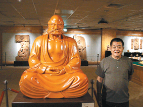 此次覽中有件模擬真人比例的達摩像,這尊達摩像雕自紐西蘭國寶級神木貝殼杉,有五種紅棕系色澤,又稱五彩,即使沉沒在沼澤中也不會腐朽的稀有樹種;要將神木運到台灣是禁止的,除非是半成品,所以吳榮賜遠赴紐西蘭雕刻一體成型的木雕像,運回台灣加工才算完成。