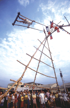鞦韆架好之後,選手們便可以輪流練習,一試身手;高聳兀立的鞦韆盪起來,有直入雲霄、凌空騰起的感覺;而落下時,則有如自由落體,直墜深淵,令人目眩神搖、膽顫心驚。因此,若非有十足的膽量與勇氣,還真不敢輕易嘗試;此外,如何運用技巧使腰部與四肢軀幹協調配合,重心平穩並掌握力道的拿捏,都是盪鞦韆的要領。