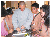 圖說:南韓弘法寺深山法師(中)與冬令營學員體驗糕點製作的樂趣。人間社記者林香梨攝