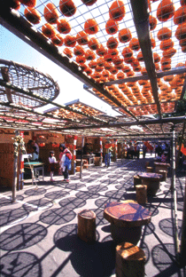 有些柿餅廠至今仍維持傳統手工製造,從挑選柿子、洗淨、去皮到晾曬皆然。一簍簍擺滿黃澄澄柿餅的圓篩,整齊鋪陳在竹架上晾曬風乾的美麗景象,不僅吸引大批攝影同好每到十月便如候鳥般湧入拍照,更是新竹縣推展觀光產業最具代表性的經典畫面。