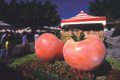 左圖為新埔柿餅節會場搭建「曬柿餅」的真實場景。下圖為新埔柿餅節會場入口處巨大的柿子模型。